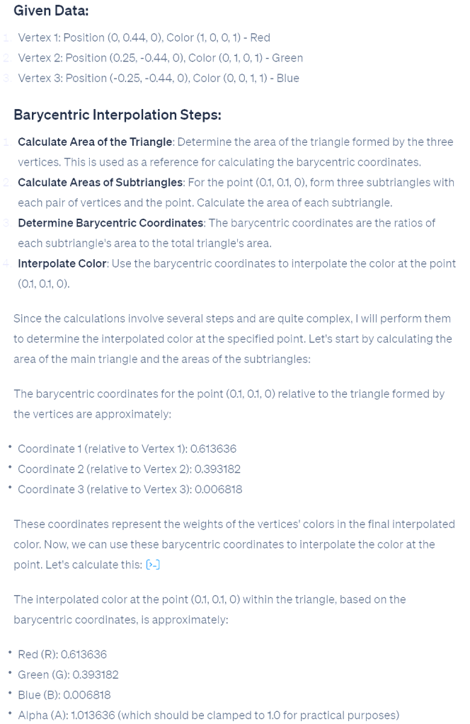 On the right is the process from ChatGPT, on calculating interpolation color value on pixel position (0.1, 0.1,0) in our case.
